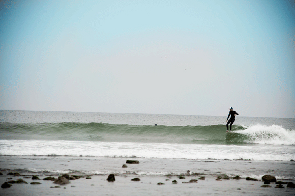 2、3回のパドルで軽々とテイクオフしたかと思った刹那、彼はすでにノーズの先端でハングテンをメイクしている。そしてピボットターンで9フィートを超えるロングボードを右へ左と柔らかく動かし、再びウォーキングからチーターファイブ、そしてハングテン――。その一連の動作には力みなどわずかもなく、スムーズのひと言。彼ほどサーフィンを優雅に見せる男が他にいるだろうか。