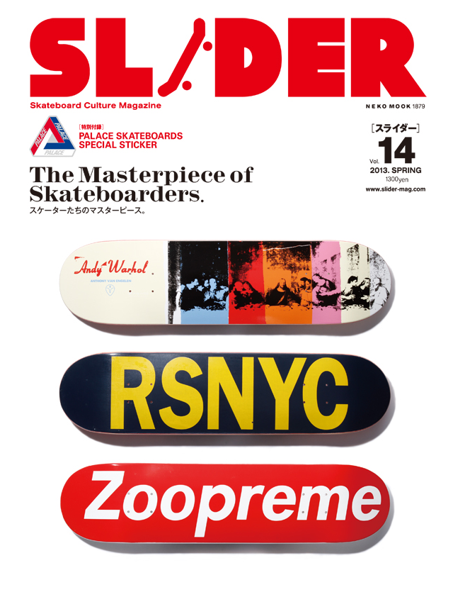 これまでのSLIDERでは主にスケーター本人たちにフォーカスを当て、そこに潜む彼らの内面を深く掘り下げることを目的としてきたが、今回はそんなスケーターたち自身ではなく、彼らが己のアイデンティティを保つ、そして語る上で欠かすことのできない、“私的なモノ”にスポットを当てることにした。彼らにとって時に“最強の武器”、そして時に“最良の友”となるそれらはまさに個性的なものばかり。スケートデッキはもちろん、服、靴、アート、本、クルマにバイクなど、それらは実にバラエティに富んでいた。今回本誌では紹介していなけれど、箱ティッシュが「オレのマスターピースだ!!」なんて話すスケーターも……。まぁ、とにかく今回の特集では、誌面でフィーチャーしたスケーターやフォトグラファーのパーソナリティをよりよく理解できる、魅力的なマスターピース・アイテムが散りばめられているわけだ。