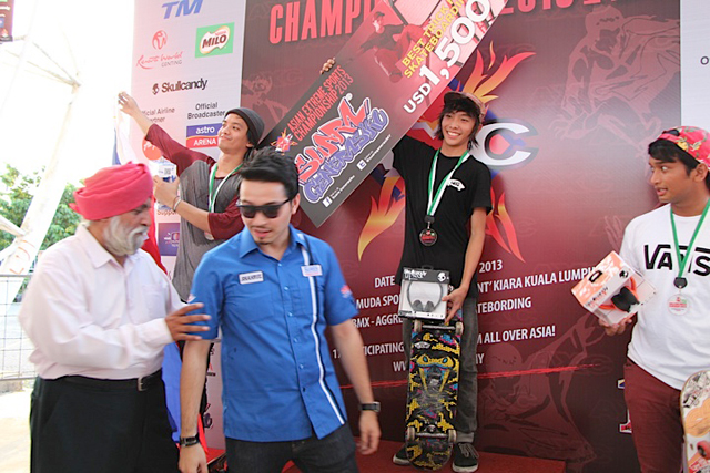 6月29、30日にマレーシアで開催された"Asian Extream Sports Championship2013"のBest Trick部門で優勝した宮坂剛矢。