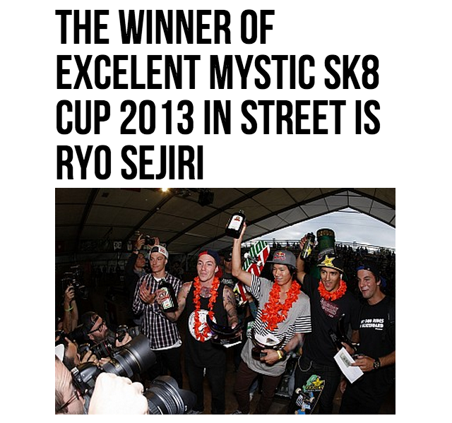 また、上記ニュースと同じタイミングで、もうひとつのビッグニュースが…。それは6月28~30日にかけてチェコのプラハで開催された"Excellent Mystic Sk8 Cup 2013"で、瀬尻 稜が見事に優勝を飾ったとのいうもの。これで彼は、5月に開催されたFar'N Highに続き、世界の大会で2連勝したという日本のスケート史上最大の快挙を達成しました。