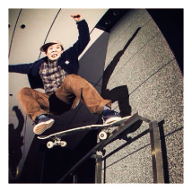 函館出身都内在住の椅子職人見習い、フェイキーマスターのゴールデンチャイルド金子次郎。カオス度指数高めで最近なにかと話題に欠かない時の人。高さとスピードをかね揃えた注目株にして、物忘れもはげしい人間臭いどろんこスケーター
