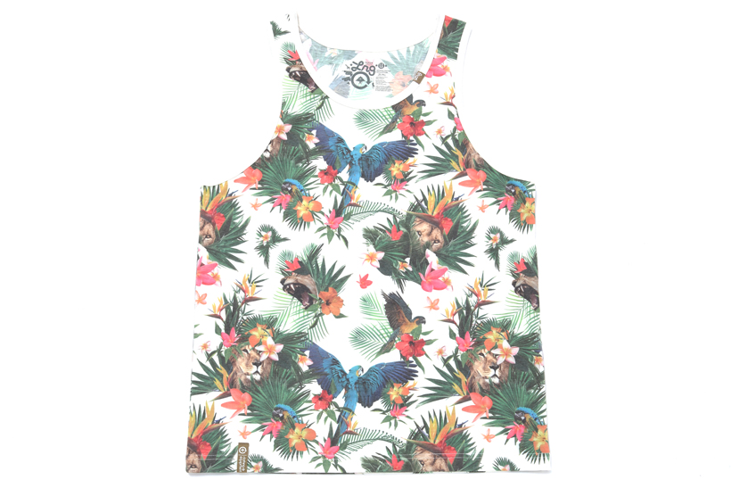 色彩豊かな南国の花に鳥、植物の陰から覗くライオンのグラフィックが特徴的な、この夏のトレンド、ボタニカル柄のタンクトップ。