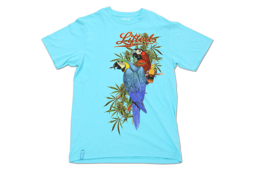 ビールをしっかり掴んだオウムのグラフィックが特徴的なTee。鳥が留まっているのは木と思いきや、実は大麻。