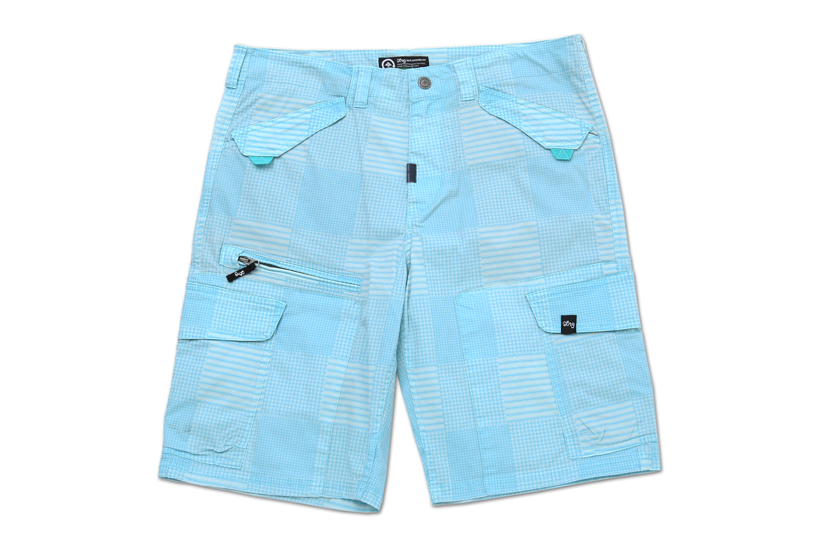 爽やかなブルーを基調とした千鳥格子柄のカーゴショーツ。数多くレイアウトされたポケットがデザインを機能を両立している。