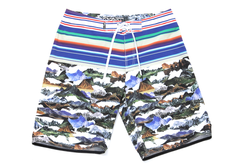 山々を背景に、日の出と日の入りをイメージしてデザインされたボードショーツ。ボードショーツならではのキレイな色味も◎。
