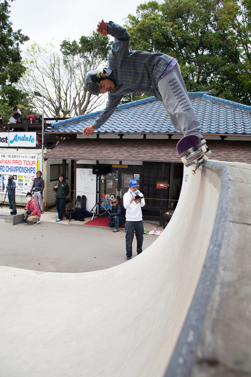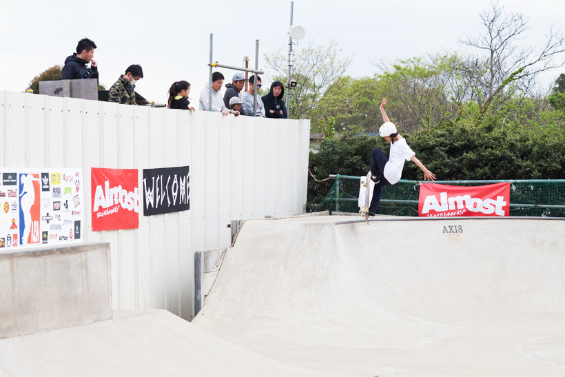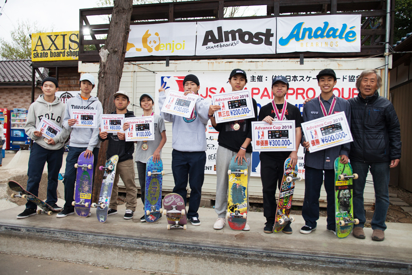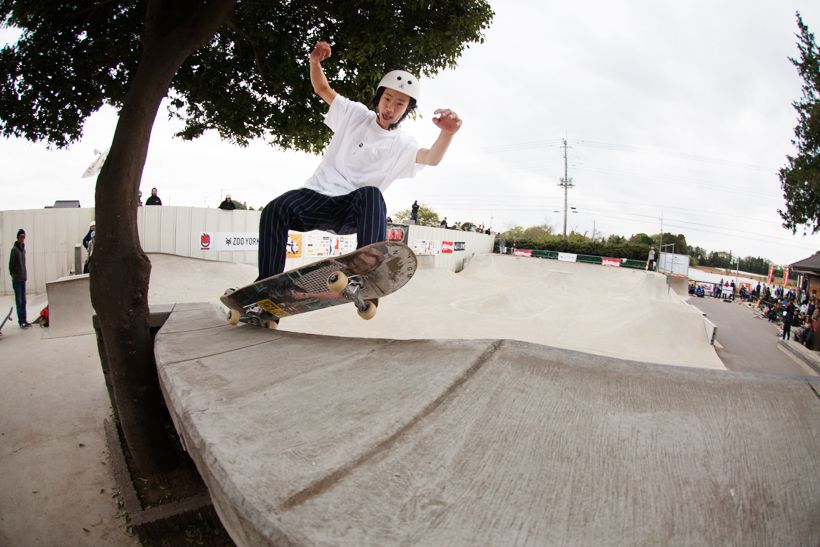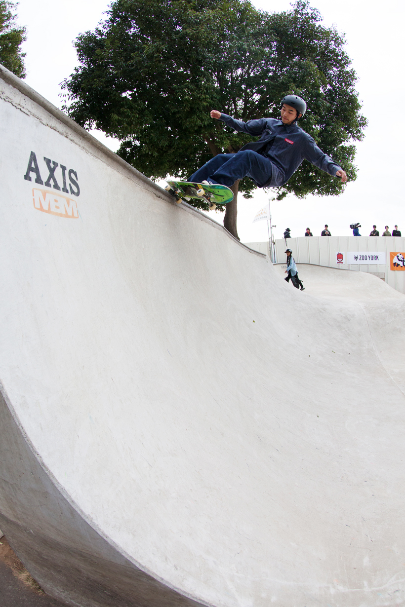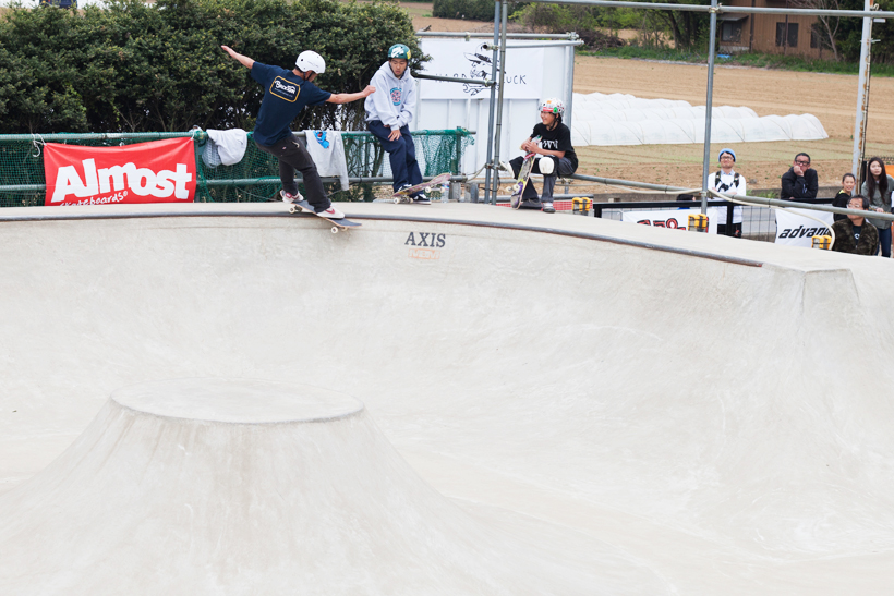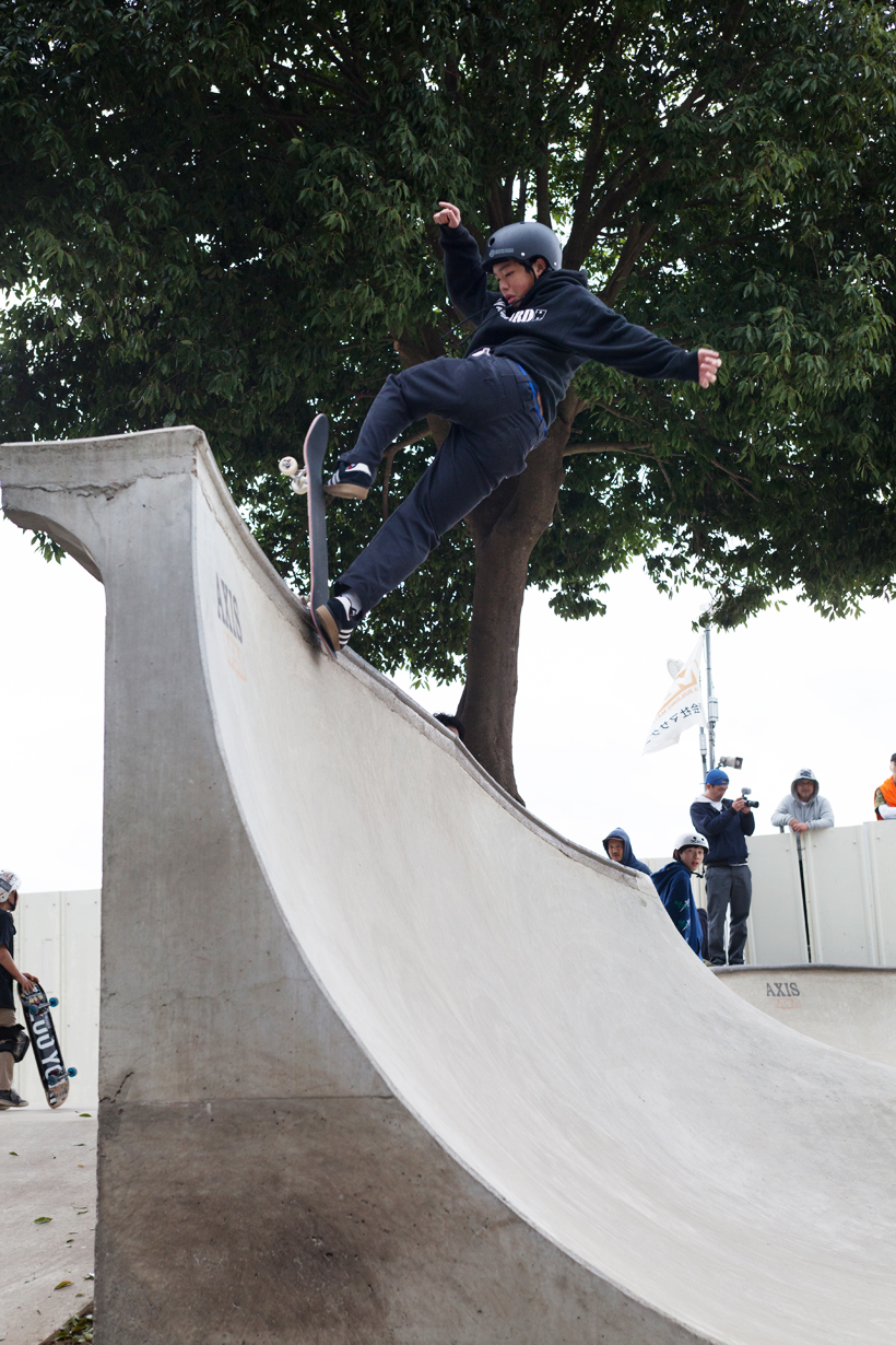 BlindやWelcomeの輸入代理店であるAdvance Marketingの名を冠したビッグイベント、Advance Cupが4月14日(土)にAxisで開催。このコンテストの魅力は何と言っても高額賞金。総額150万円という賞金を目当てに集まったスケーターが2日間に渡り熾烈なバトルをくりひろげるこちらのイベント、今年は天候不順のため1日のみの開催。39名を8つのグループに分けて行われた予選を経て決勝に進出したのは12名。錚々たるメンバーのなかでも、ハイスピードでトランジションを攻略した田中 陽が見事に優勝を飾った。