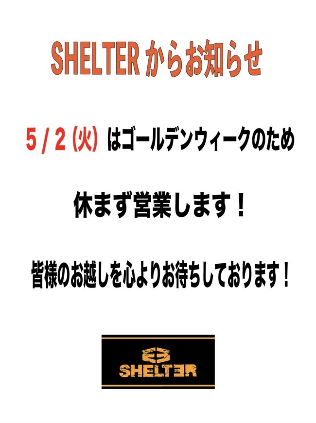 そんな期待溢れるゴールデンウィークはSHELTERも定休日返上で休みなく営業致します!