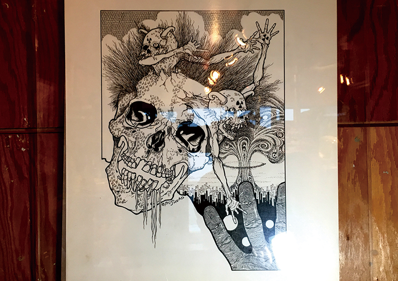 国際的なアーティストとして知られるPUSHEAD。独自のスタイルで描くスカルモチーフのアートワークが特徴で、世界各地にフォロワーが存在します。スケートボーダー、ハードコアパンクバンドのシンガーとしての顔を持ち、'80年代にThrasherやZorlacに提供した数々のアートワークはあまりにも有名。アートを通じて多ジャンルへのクロスオーバーを牽引した代表的なアーティスト。写真の作品は某氏所有の原画(!!)で、日本のあるレジェンドハードコアバンドのアルバムカバーになる予定だったものだとか!?