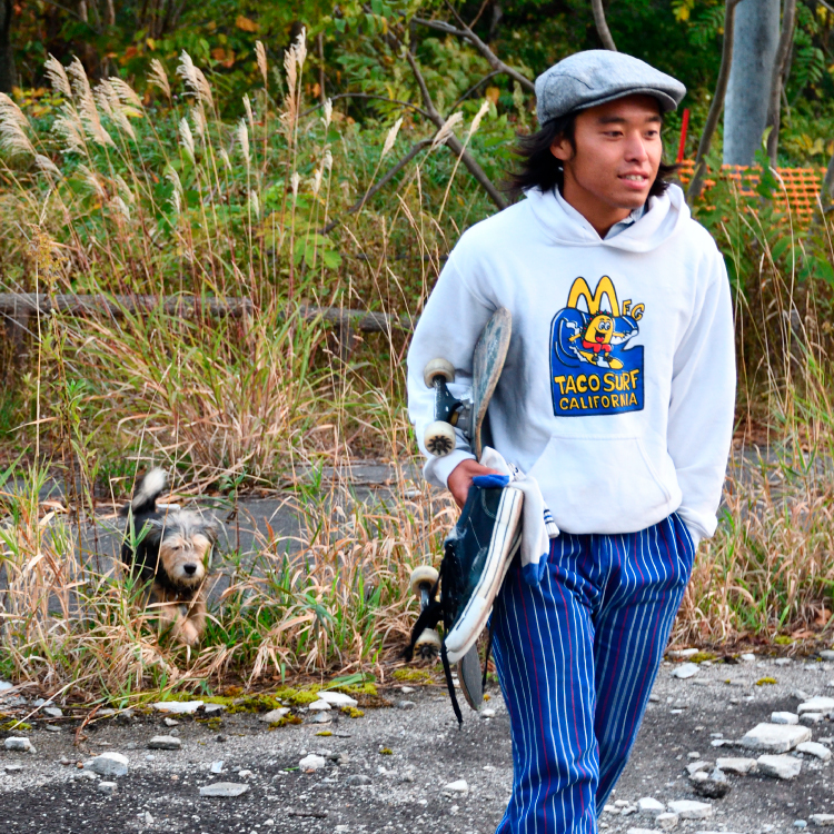 Rinnosuke Fukuda wears blue pants every day. He's been traveling across Japan while working on TACOSURF MFG, a skate brand that he's in charge of the graphics.