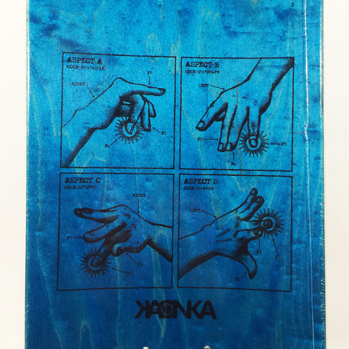 KAONKAのRiderはスタイルに重きを置いて滑る傾向があり、それは手や指の形に関してももちろん重要視しています。そんな各Riderのこだわりの手(指)の形をモチーフに怪しさ満点のデザイン仕上げてみました。手から表現される「Handcode」を読み取ってみてください、ワレワレハユビヲタテマス。サイズ展開は7.56″、7.75″、8″、8.18″の4サイズ展開です。