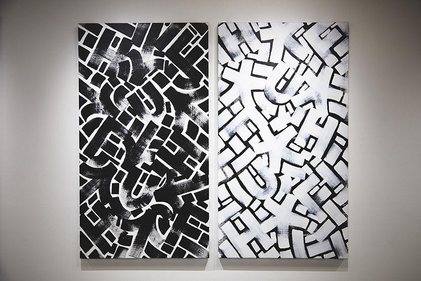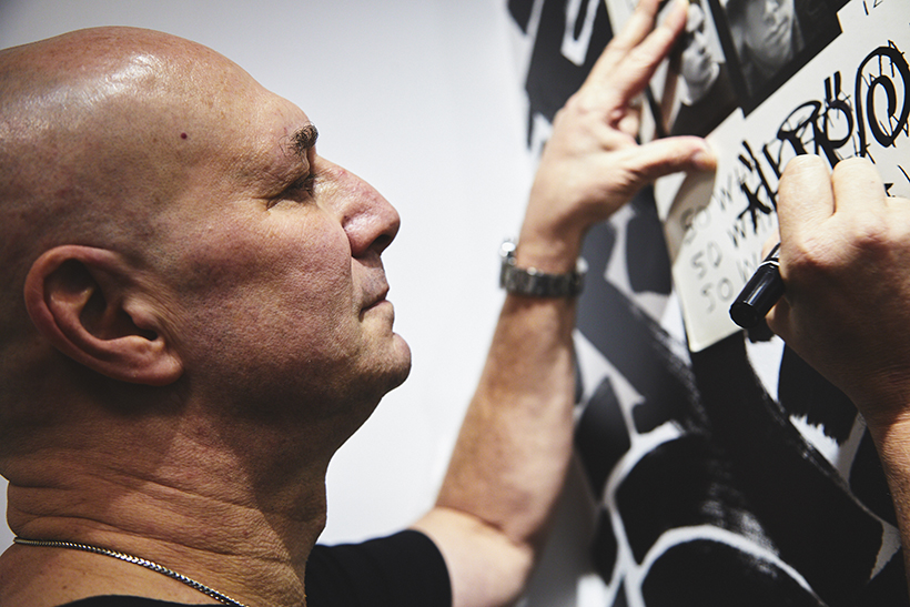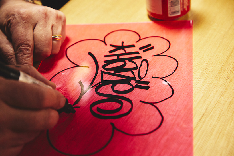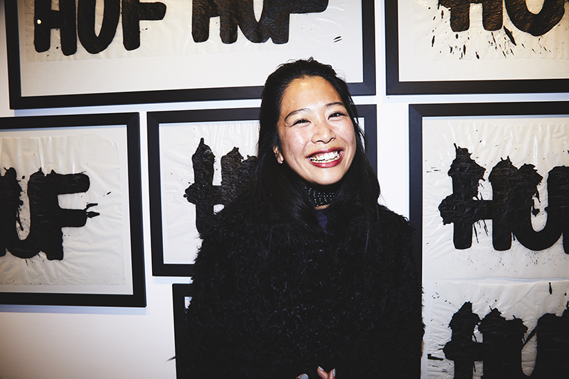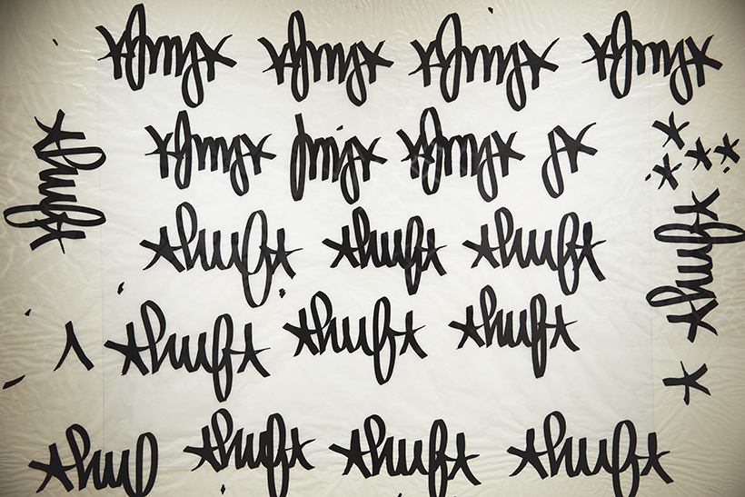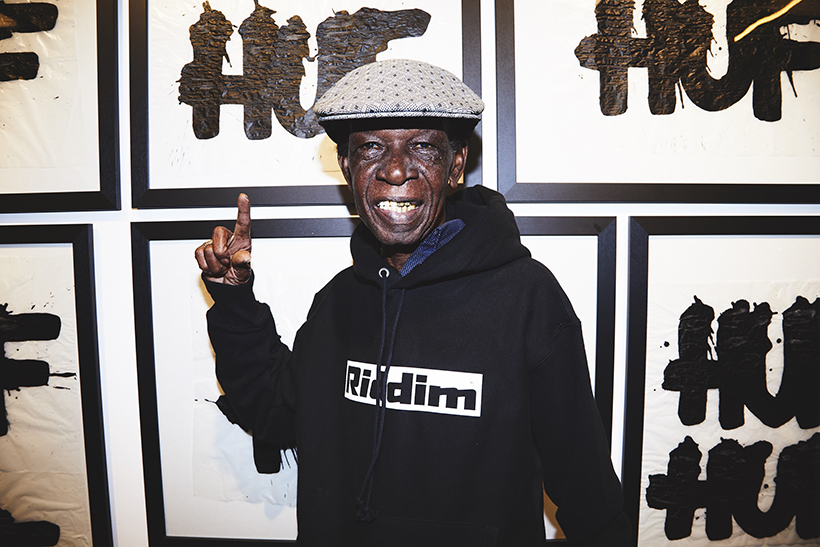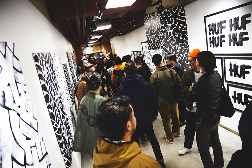 会場では本個展のために描き下ろされたピースをはじめ、これまでにHUFと行われたコラボのデザインの原画を展示。Tommy Boy、Cold Chillin’、EPMDやBeastie Boysなど、Hip-Hop史におけるあまりにも重要なロゴを残したアーティストが来場するとあり、当日はファンが押し寄せてサイン攻めに遭うという一幕も。