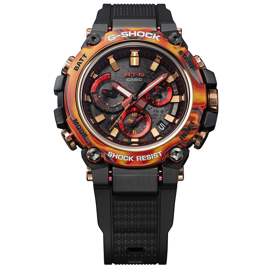 太陽フレアを蓄光素材のマーブル模様の積層ベゼルで表現したMTG-B3000FR-1AJRとGWG-2040FR-1AJRの2モデル。