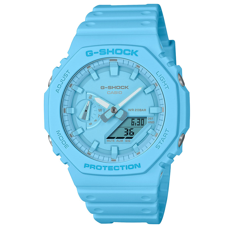 オクタゴンベゼルが人気のGA-2100をベースに、ターコイズブルー、ホワイト、ヴォルトイエローの3色展開。