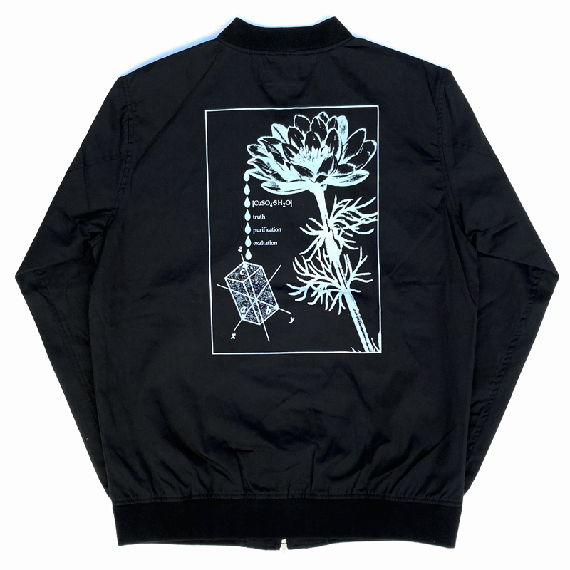 高澤祐介シグネチャーデッキのデザインをバックに配したナイロンジャケット。Chalcanthite Stadium Jacket ¥10,780