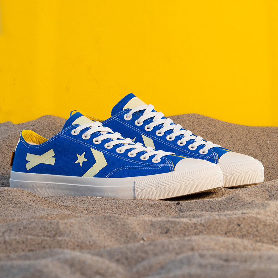 CHEVRON&STARを筆頭にアッパー各所をテープでカスタマイズしたかのようなプリントを採用し、鮮やかなブルーにマットホワイト&イエローのさわやかな配色も特徴。