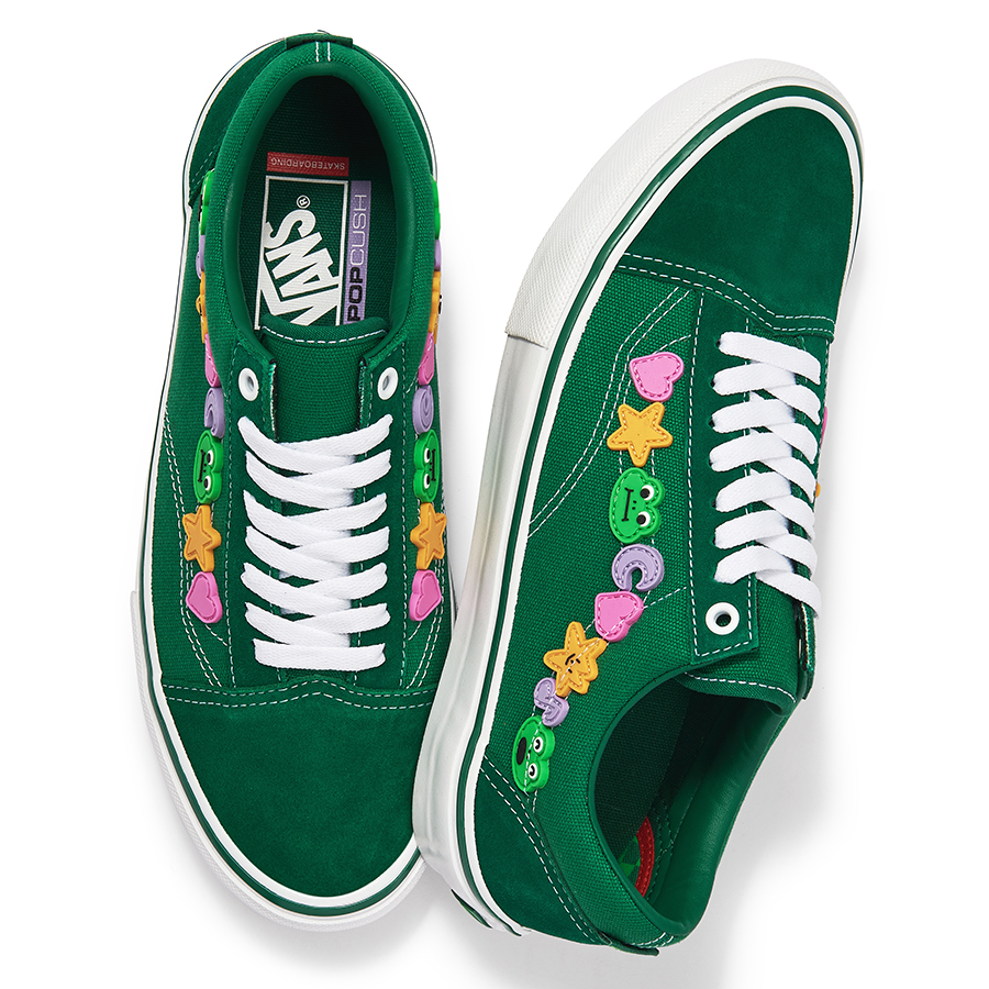 Old Skoolをベースに、サイドストライプにシリコンチャームを用いたポップで遊び心あふれるデザイン。