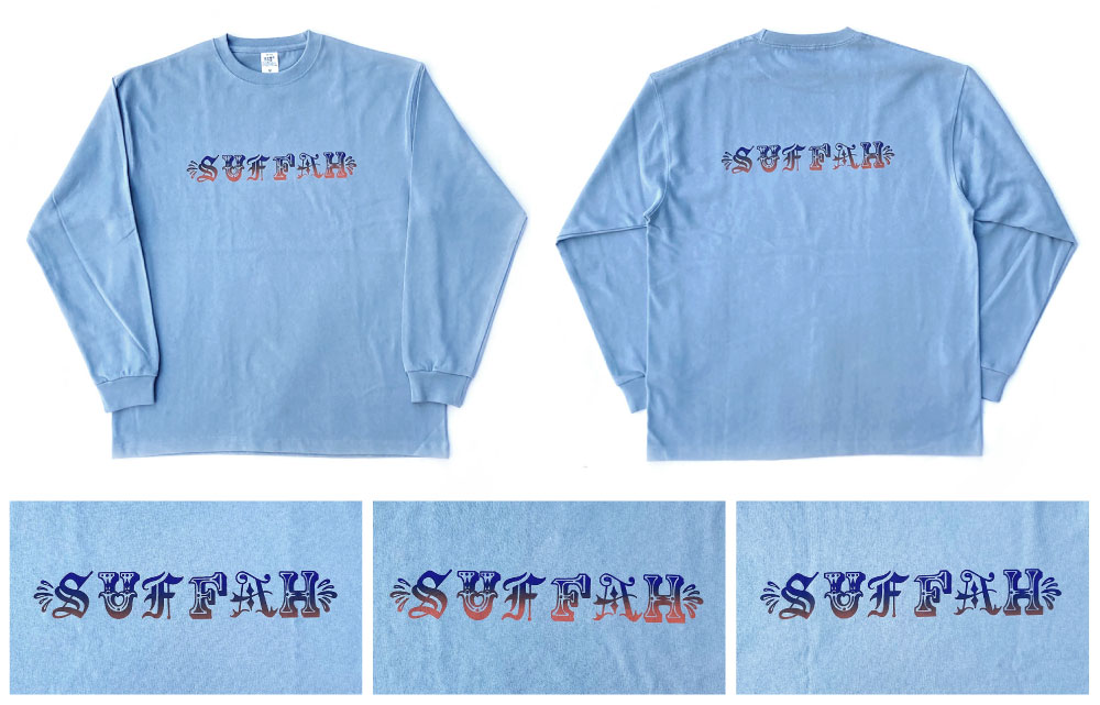 厚手の9.1ozのベースに定番のロゴが手刷りプリントのグラデーション仕様でフロントとバックに入ります。プリント内にはバイブスストーンの粉が練り込まれていてるリカバリーウエアの仕様にもなっています。プリントのグラデーション感は手摺りのため一つ一つ質感が変わりますので同じものは2つと無い仕様になっています。