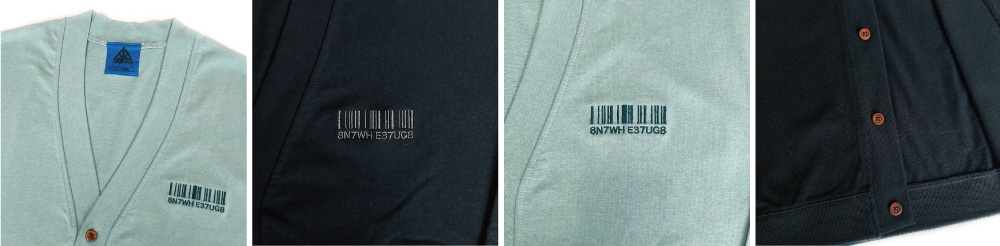 ▲胸元には水田准がデザインしたbarcodeロゴの刺繍が、ボタンは全て木製仕様となります。