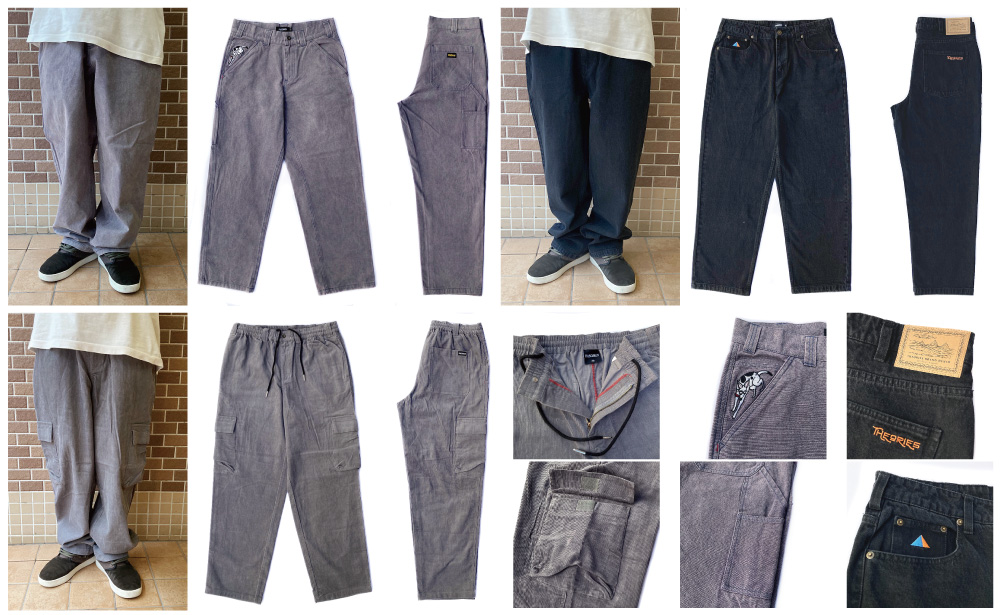 ▲2024 FALL piano trap carpenter pants WASHED.LAVENDER 価格:17,600円(税込)、pavillion jeans pants WASHED.BLACK 価格:17,600円(税抜)、Stamp lounge cargo cord WALF.GREY 価格:16,500円(税込)