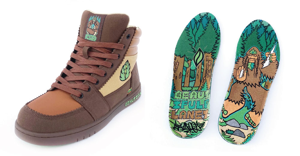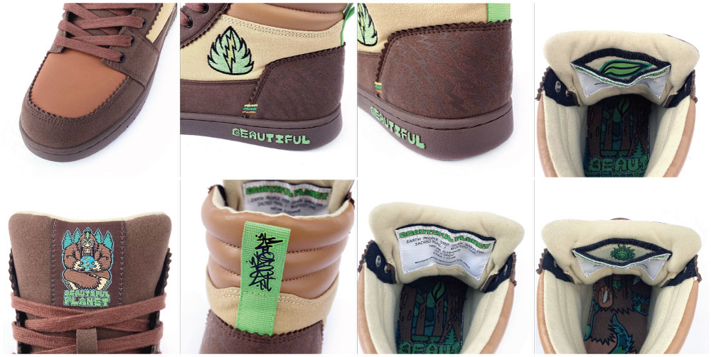 新モデルのアーティストBIGFOOTのモデルが登場です。アウトドアテイスト溢れるトレイルブーツのようなフォルムのモデルです。素材はベーガンスエードやヘンプ等を使用していてベーガンの人でも気にすることなく履くことが出来る1足です。タンの内側にメッセージ付きスタッシュポケットが付き、BIGFOOTがデザインを手掛けた高品質のインソールの表面はhemp生地を使用しています。アウトソールは高度を上げて型崩れしにくい仕様に変更、ソールパターン部は従来と同じ硬さで柔らかめでグリッピーなので足裏感覚に優れています。随所にBIGFOOTらしいアクセントが入るデザインで、BIGFOOTファンなら必ず1足は持っていたい一品。