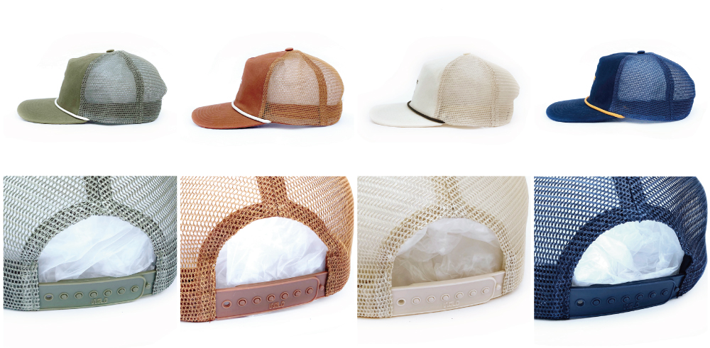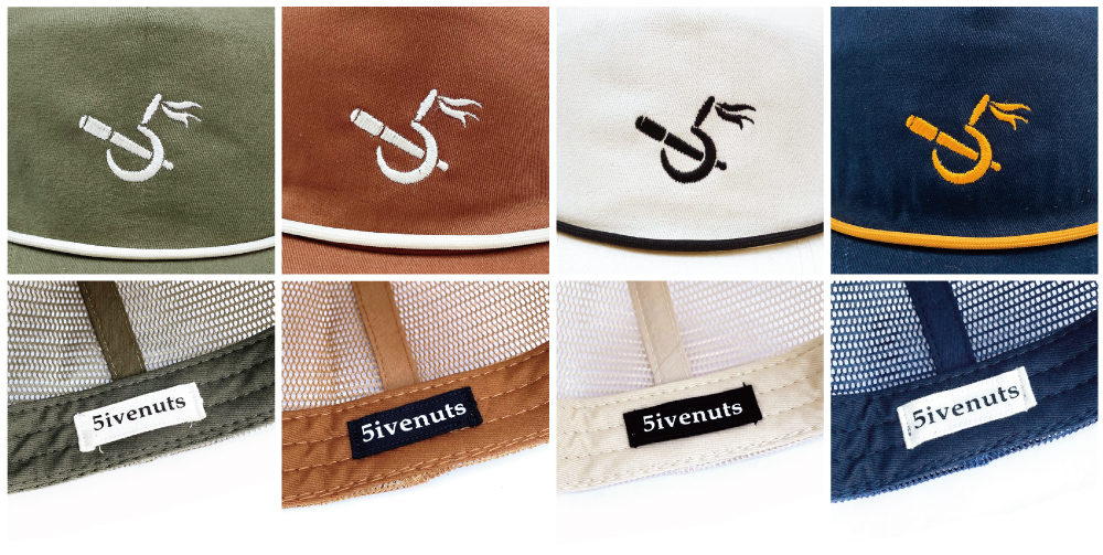 ▲2025 SUMMER 5ivenuts hunt logo EMB mesh cap KHAKI(左), RUST(中央左), IVORY(中央右), NAVY(右) 各価格:6,160円(税込)