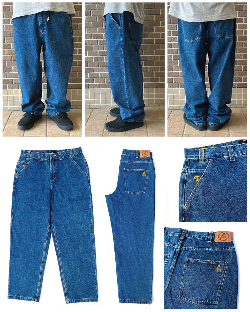 定番のゆったりバギーフットのワイドシルエットのplaza jeansをベースに動きやすさを重視しながら全体的に細くなったシルエットです。高級感あるPUレザーパッチに、ポケットには刺繍が入ります。