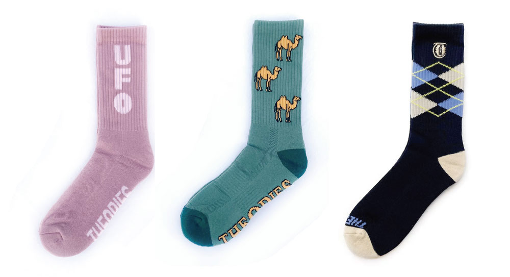 今回はサイドにUFOと入るパンチの効いたデザインのUFO socks、ラクダをモチーフにしたデザインがランダムで入るsahara socks、定番のアーガイル柄のargyle socksです。