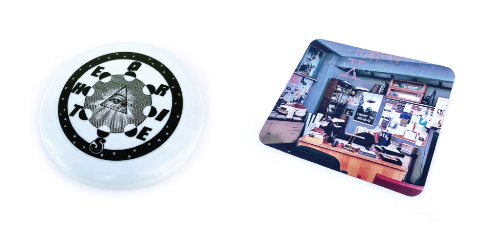 定番morning starのデザインが入り、蓄光仕様となるフリスビーとアメリカの昔の某オカルトドラマ〇-filをモチーフにしたデザインのマウスパッドです。