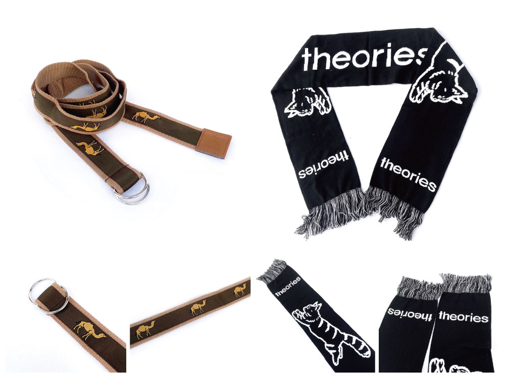 こちらはコットン素材のベルト部にラクダをモチーフにしたテープがあしらってあるsahara D-ring beltと、クルーのNyle Lovettの飼う猫をモチーフにしたデザインのcoscious kitty scarfです。