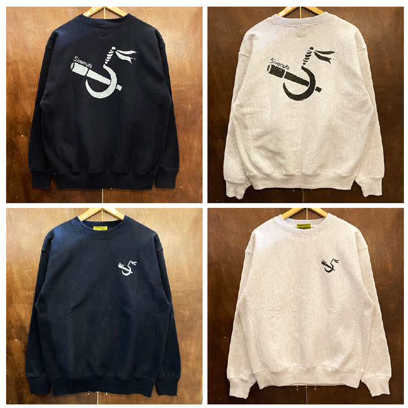合わせてこちらは上質な12ozの厚手のぼでぃを使用したCrewneckです。某チャン〇オン風な高級感あふれるベースを使用しますが何か。デザインは当店看板にも使用中のRider土屋けいし君がデザインしたhunt logoが前と後ろに入りやがります。