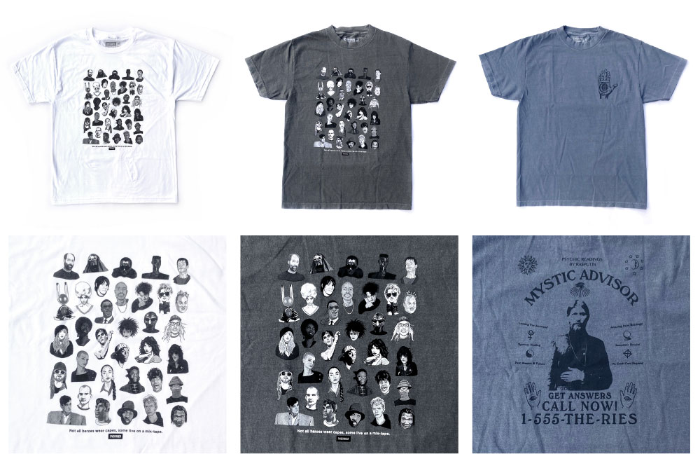 今回は色々なミュージシャンのイラストをコラージュしたmixtape、ニューヨークの街を意味するbig apple、占いの広告をモチーフにした怪しいmystic adviser、怪しいお面が並ぶ写真をモチーフにしたparanoiaとなります。mystic adviserは後染め仕様となります。