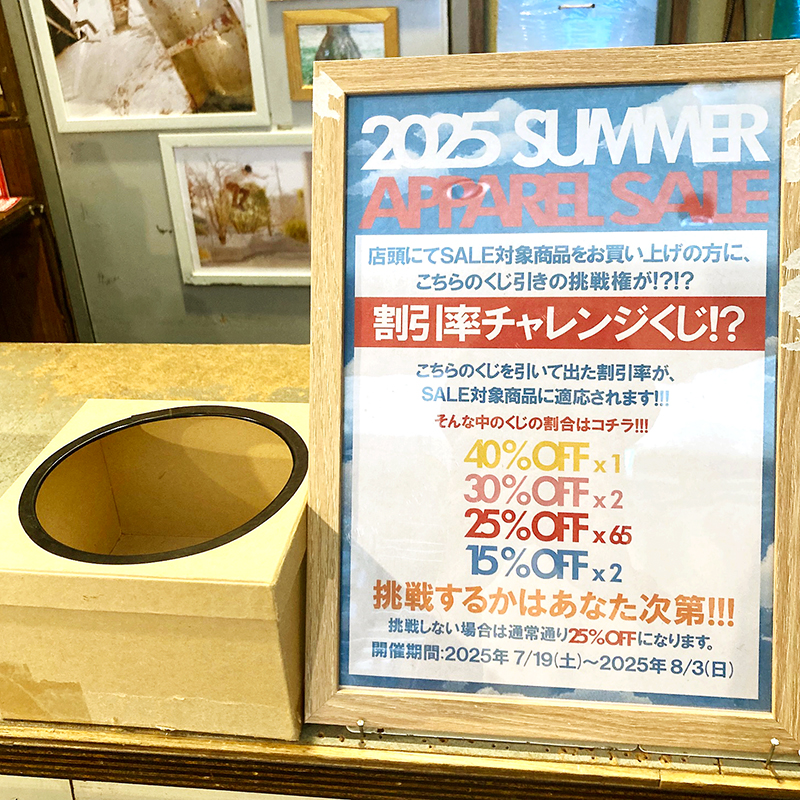 店頭限定ですがSALE対象商品をお買い上げの方は割引率チャレンジくじに挑戦が可能でやんす。挑戦しなければそのまま25%OFFとなります。ですが引いて出た割引率がその商品に適用!よりお得になる可能性も...。挑戦者求む!