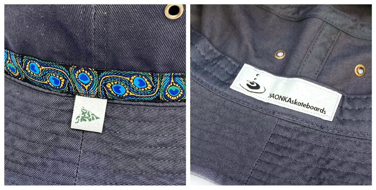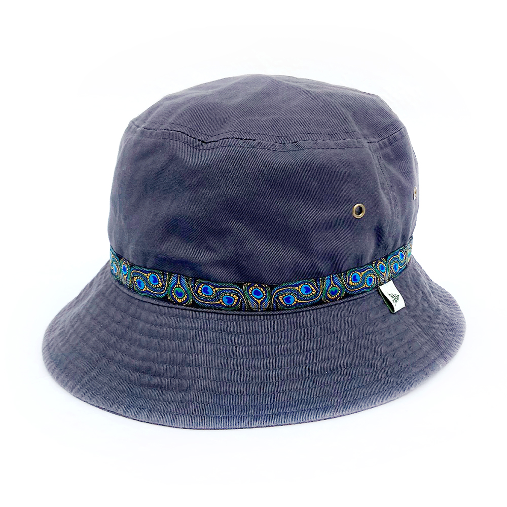 定番の幾何学模様風なテープをあしらったhatの新色でやんす。今回はCHARCOALのベースに孔雀柄のテープが一周あしらってありやんす。使い勝手の良いバケットハットでやんすで~。