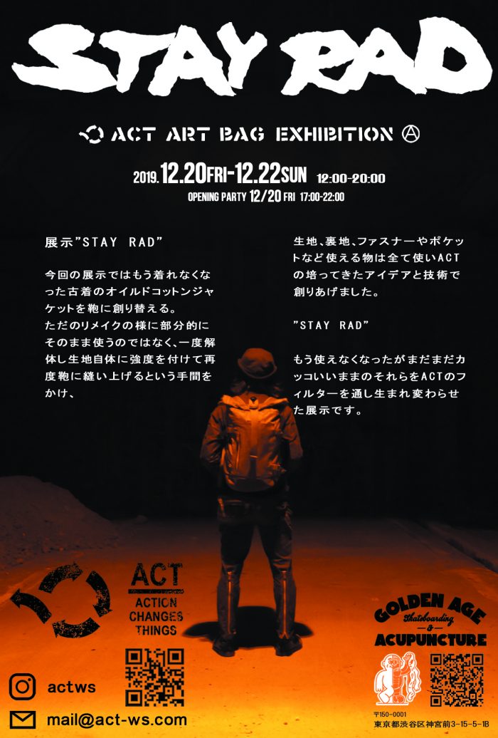 我ら OSAKA DAGGERSのオリジナルメンバーの1人であるジュンペイことJPによるブランド、 ACT のエキシビジョンが、東京は渋谷の GOLDEN AGE TOKYO にて開催されます。