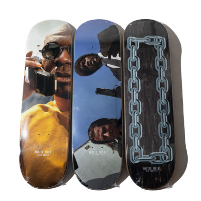 年に数回しかリリースされない新作デッキも、いつもスケーターのツボを心得ていてたまらない。今回は、PULP FICTIONネタだ。車のトランクから見上げたジュールス&ヴィンセントとBad mother F◯ckerと吐き捨て中のウォレス。高解像度プリントなのがマジで最高。