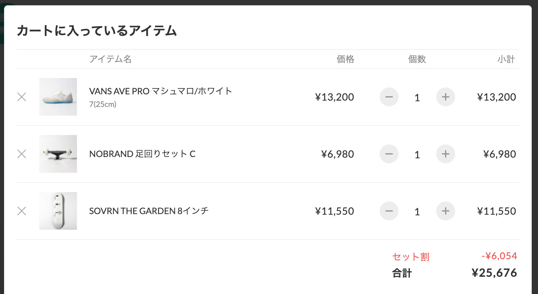 足回りセット+シューズで購入すると、30%オフです。デッキは、割引対象じゃないけど、↓こんな感じで、やっぱりお買い得です。