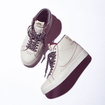 ビンテージホワイトレザーのアッパーは、トリックで削れることで、バーガンディに変化。トゥの星型の加工、千鳥柄のシューレースとインナー、編み込みベルトのヒール、スウッシュと薔薇をたずさえたクリアソールなど、情熱的でクラシックなBLAZER MIDに仕上がっています。