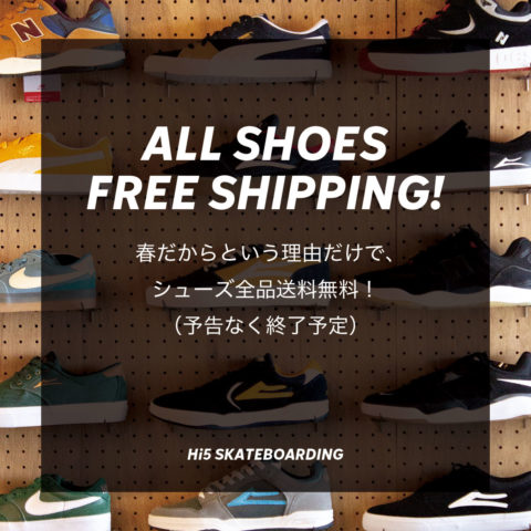 春になってきたし、新しいシューズでスケボーしよう!ってことで、シューズ全品送料無料キャンペーン中です。