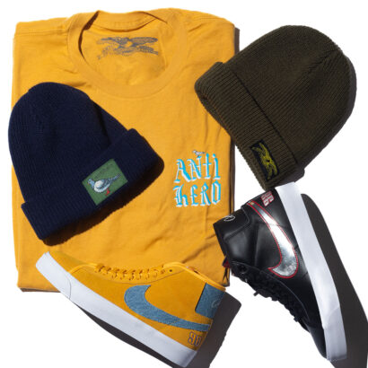 NIKE SBのグラント・テイラーシグネチャー BLAZER GT。なかなか出ないミッドカットだし、タミヤのデカールカスタムを思い出すスピード狂仕様だから、フルプッシュ派スケーターは絶対にチェック。グラントが所属するANTI HEROのアパレルは、誰にも媚びていなくて最高にカッコいいのだ。
