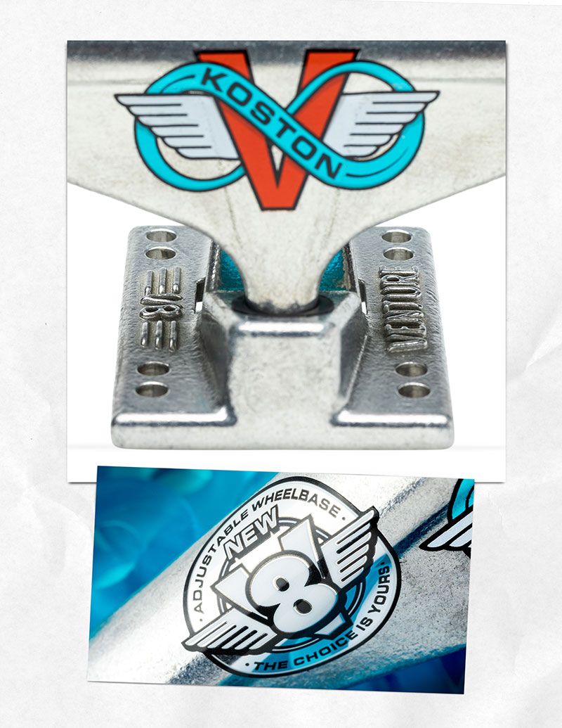 コストンが提案した新しいVENTUREトラックが、KOSTON PRO V8。ピボットが刷新されてカービングがスムーズになったり、ノーズスライドでレッジに当たる部分も再設計され、引っかかりにくくなって、長くスライドしやすくなったりしているのだけど、とにかく一番大きいアップデートは、ベースプレートのボルト穴! ボルト穴を8つにすることで、トラックをズラしてデッキに取り付けることができる。そうすることで、ウィールベースを長くしたり、短くしたりできるということなのだーー!
