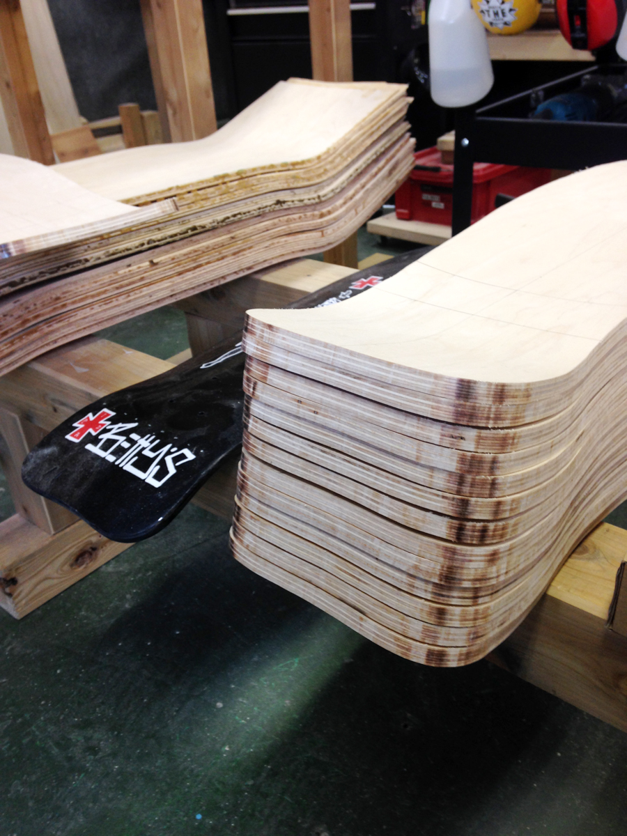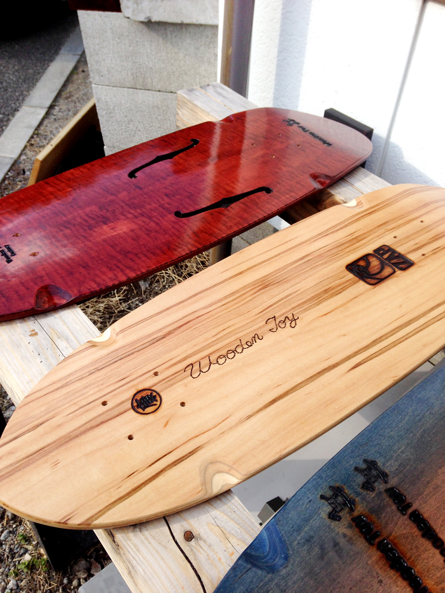 大場組ではナチュラルな木の質感を大事にしており、プレスされたベニヤの木目や雰囲気に合わせた加工と塗装でその板に特徴を持たせることで各デッキの個性を引き立たせる。