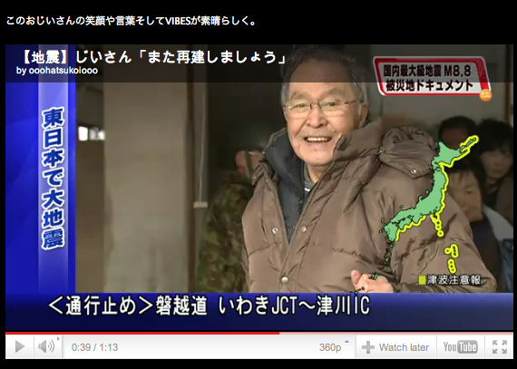 BLOG: HIROSHI OTAKI ハニカムのDJ DARUMA君のページより引用しています。 このじいさ… ──無題 2011.03.15 ハニカムのDJ DARUMA君のページより引用しています。 このじいさん、イキイキしてる。 若い頃にさんざん日本を作って来た頃に戻ったみたい。 日本人には裕福な暮らしは似合わない。 這い上がってくる姿が似合うのかな?