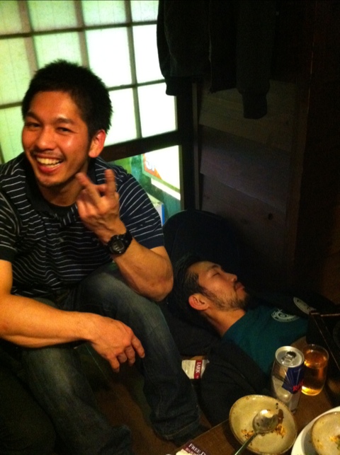 飲み過ぎて睡魔が襲い、耐えられずに寝てしまったイトシン君、沖縄出身のMr. オールラウンダー 正隆君、