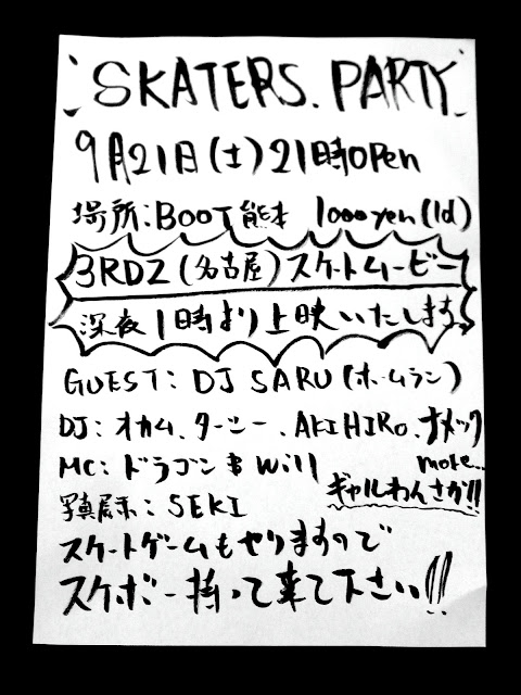 ──SKATERS PARTY !! 3RDZ DVD 上映会 9月21日(土)at 熊本BOOT