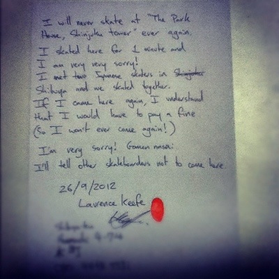 BLOG: LAURENCE KEEFE Shinjuku police made me write this … ──スケボーぜったいダメだね 2012.09.30 Shinjuku police made me write this and sign it with a fingerprint