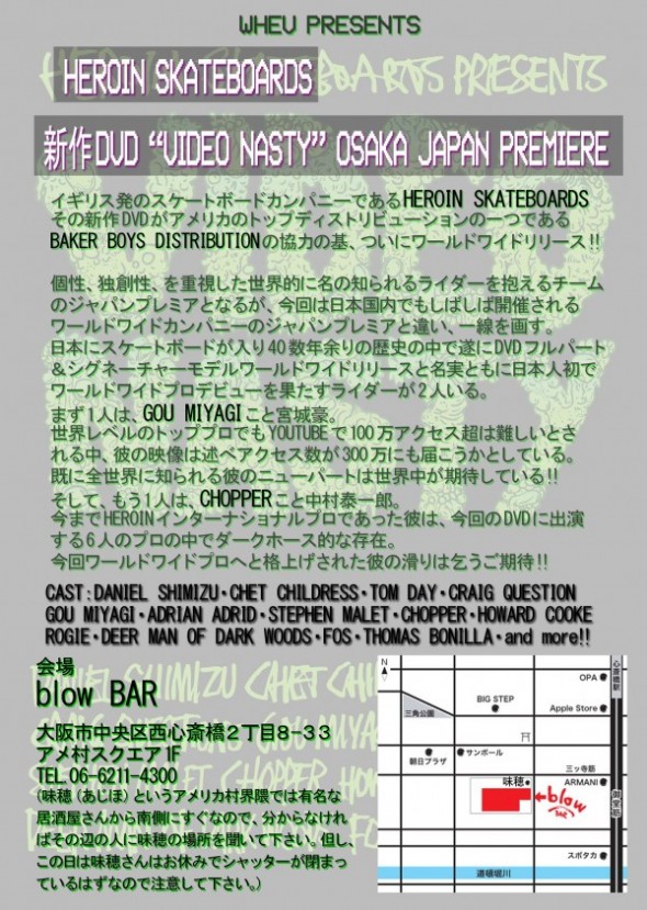 Heroin Skateboards『VIDEO NASTY』の完成試写会が開催です。