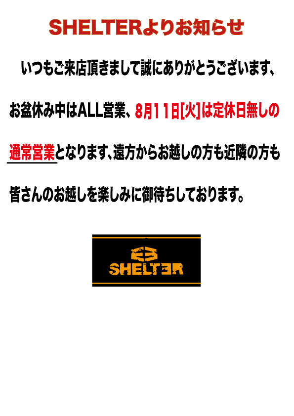 ──連休明けの月曜日もSHELTERオープン、今週はあのデッキが到着!? & お盆のご案内!