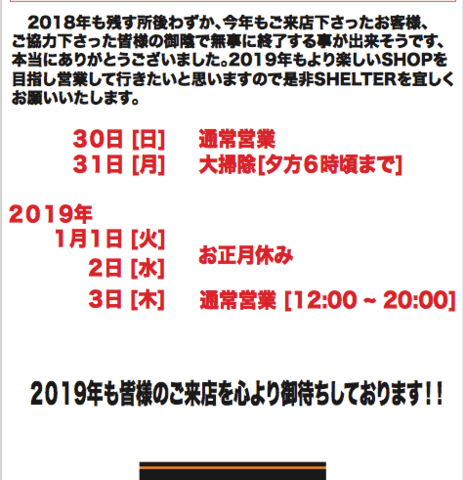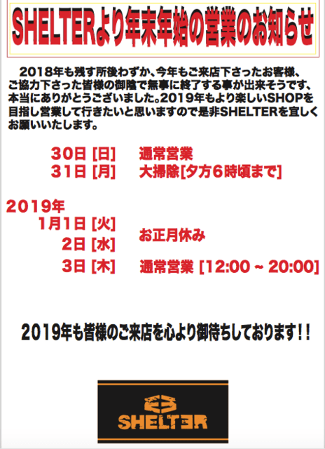 そして年末年始のお知らせです、今年もラストまで、そして年初め初売りもSHELTERを宜しくお願い致します。