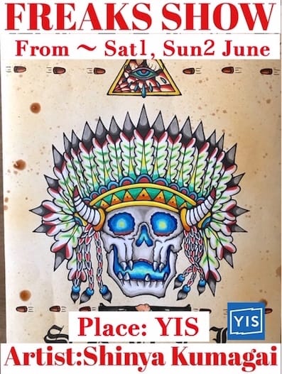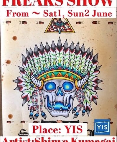 そして6月一発目の本日はお店からもすぐ近くのトアウエストにある CAFE & DINNER YIS にて札幌出身のスケーター 熊谷 伸哉の作り出すFREAKS SKATEBOARDのART SHOWが開催されております!!