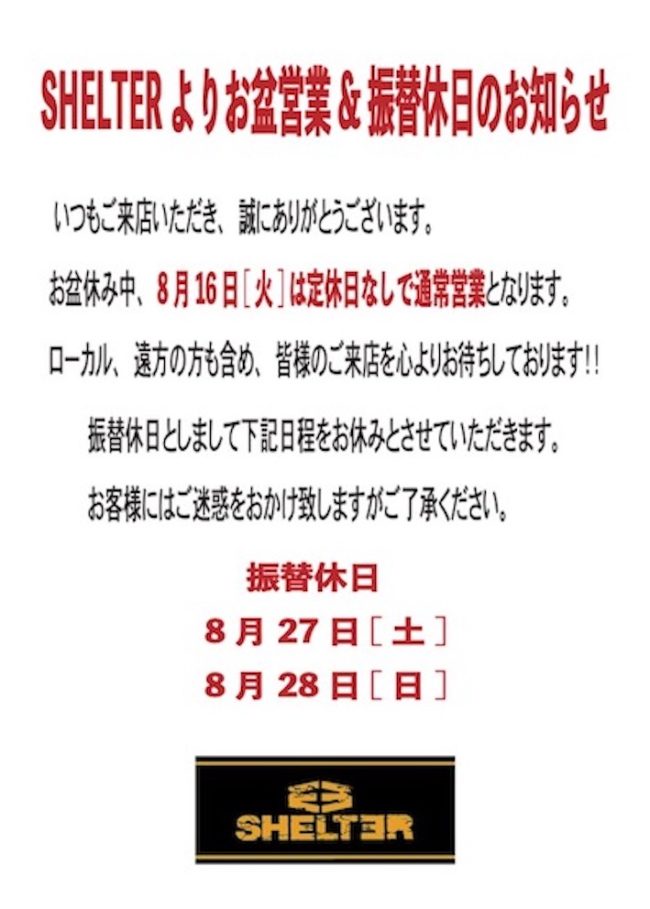 BLOG: SHELTER SKATE SHOP いよいよお盆休みスタート! 本日よりいろいろと地方へ就職したスケーター…──お盆突入!昨日より一足先に遠方からスケーターが神戸入り!本日もオープンです!! 2022.08.11